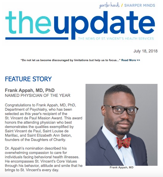 Dr. Appah served as the Unit Chief for the Psychiatric Inpatient Unit at St. Vincent’s Medical Center in Bridgeport, Connecticut, where he specialized in the care of individuals with mood, anxiety, personality, psychotic, and substance use disorders. In September of 2018, Dr. Appah received St.Vincent’s Medical Center’s St. Vincent De Paul Award as “Physician of the Year.”